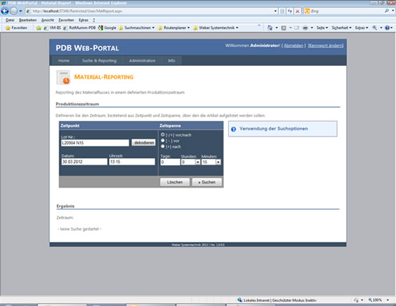 Mit dem PDB Web-Portal steht dem Anwender ein Interface zur Verfügung welches eine einfache Suche von durch das ID-Terminal erfassten Produktions- bzw. Prozessdaten ermöglicht.